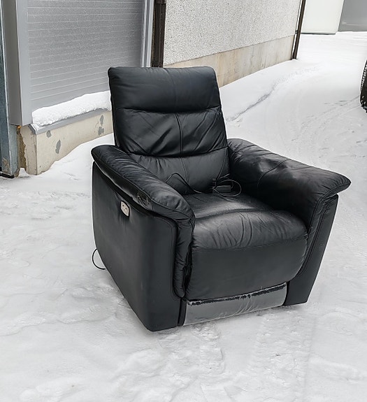 Käytetty keinutuoli mustalla nahkaverhoilulla, hyvä aihio vaikka entisöintiin. Nopeimmalle noutohinta 10 euroa!
