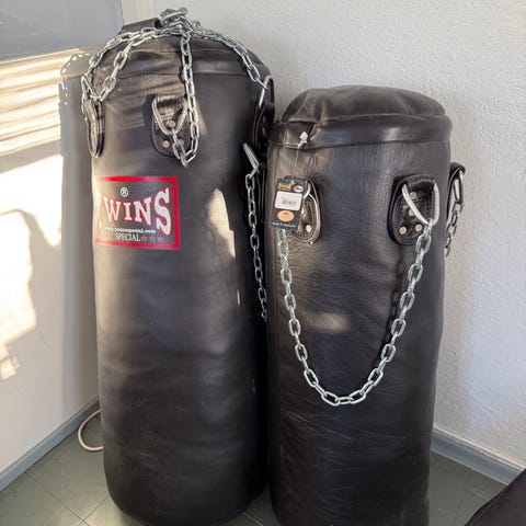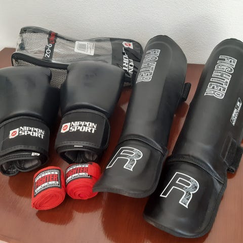 Twins nyrkkeilyhanskat ja säärisuojat sekä FBT potkutyynyt. Mustat Twins-hanskat ranteen tarrakiinnityksellä soveltuvat nyrkkeilyyn ja potkunyrkkeilyyn. Twins-säärisuojat ovat pitkät ja pehmustetut, ja niissä on tarrakiinnitys säären ja nilkan tukemiseen. FBT-merkkiset kaarevat potkutyynyt on tarkoitettu lyönti- ja potkutekniikoiden harjoitteluun parin kanssa. Varusteet sopivat kamppailulajien, kuten nyrkkeilyn, potkunyrkkeilyn ja thaiboxin, harjoitteluun.