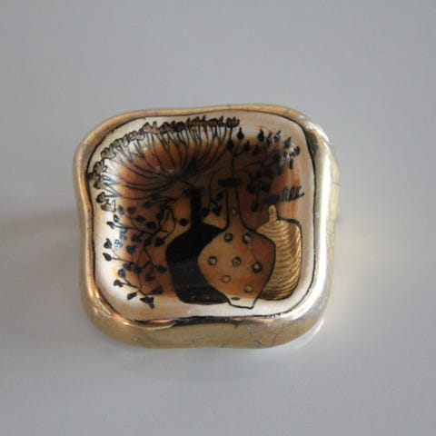 Myydään kaunis rintakoru, rintaneula, käsinmaalattua posliinisavea. Koveraan rintakoruun on maalattu naisen kasvot, korun reunat ovat kullanväriset. Korun takana on metallinen neulapohja kiinnitysneuloineen. Korun halkaisija noin 35 mm. Signeeraus LK, mustat nimikirjaimet korun etupuolella. Valmistusaika 1950-60 -luku? Iänmukaista kulumaa, lasitteessa pieni jälki, muuten korun kunto hyvä.