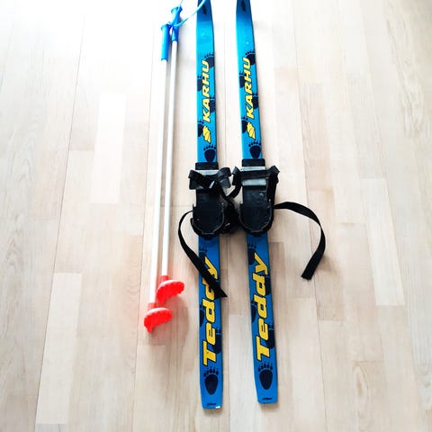 Myydään hyväkuntoiset "ensisukset" lapselle. Kenkään kiinnitettävät siteet sopii hyvin esimerkiksi kuomiin.