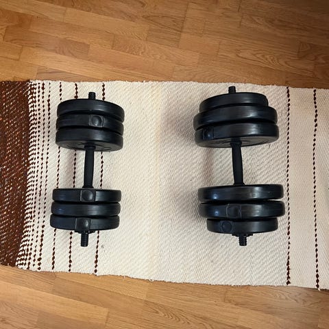 Metalliset käsipainot. Painoja voi säätää itse, sillä kiekot irrotettavissa. Toimivat hyvin. Parvekkeella käytössä olleet. Nyt vuoden ajan säilytetty häkkivarastossa. Katso kuvista kunto.