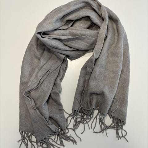 Vihreä kaulahuivi. Huivin päissä hapsut.