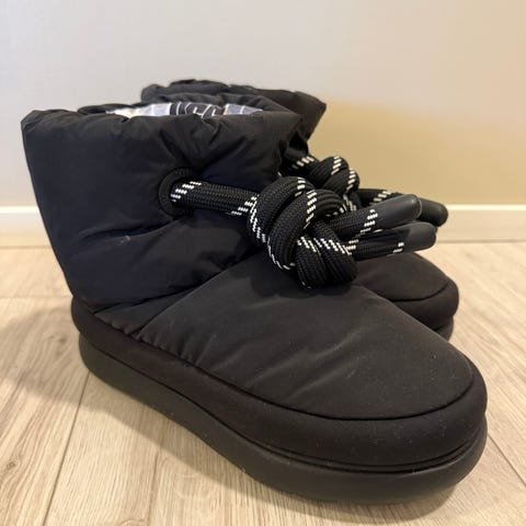 Tummansiniset Ugg Moonboots kengät. Lämpimät talvikengät joissa paksut, pitävät pohjat ja karvareunus. Reilu koko 38. Hologrammi