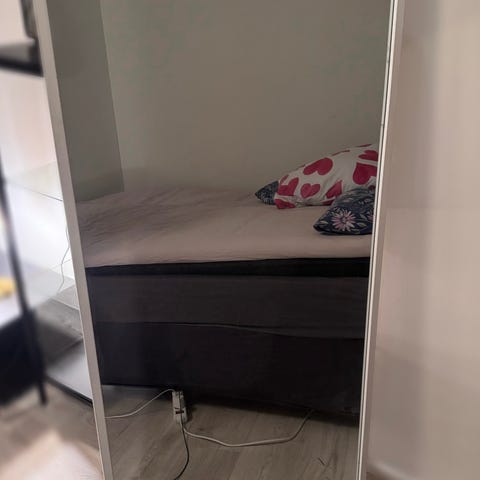 IKEA peilikaappi, jossa täyskorkea peili etupuolella ja avohyllyt sivussa. Väri valkoinen. Sopii esimerkiksi eteiseen, makuuhuoneeseen tai vaatehuoneeseen säilytystilaksi ja pukeutumisen apuvälineeksi.