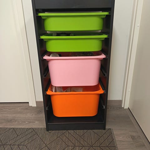 Ikea lasten säilytyshylly ja laatikot, pieni käytönjälkiä on, yleisilme kuitenkin siisti ja jäljet normaali käytössä aika huomaamattomat.