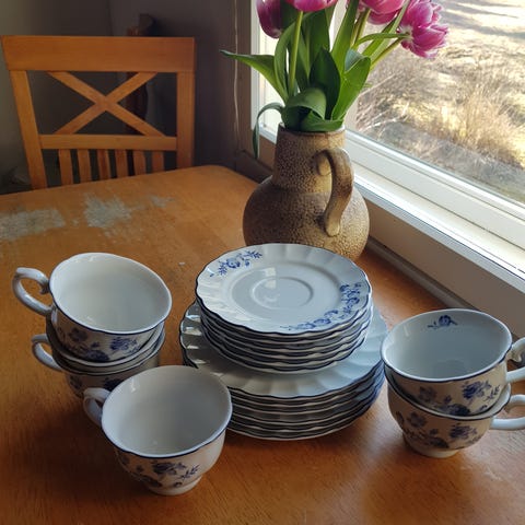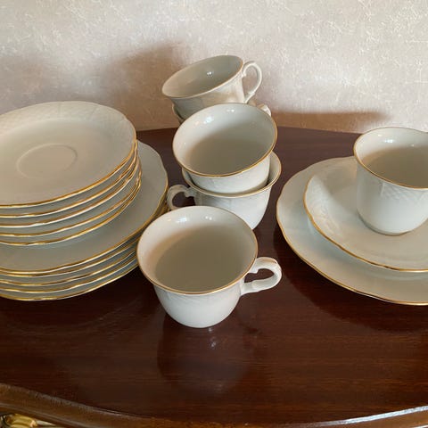 Kahviastiasto kultayksityiskohdilla. Settiin kuuluu 7 kahvikuppia,6 aluslautasta,8 pullalautasta ja kaksi tarjoilulautasta sekä sokerikko ja kermakko. Kahvikuppien tilavuus 1,5dl, aluslautaset 13 cm, pullalautaset 17 cm ja tarjoilulautaset 24 cm. Yhdessä kahvikupissa on pieni risku reunassa josta kuva kommenteissa sekä sokerikon kannessa myös, toisessa tarjoilulautasessa kulumaa/tummentumaa. Muutoin hyvässä kunnossa.