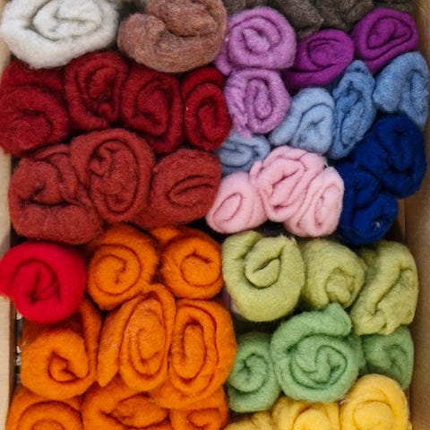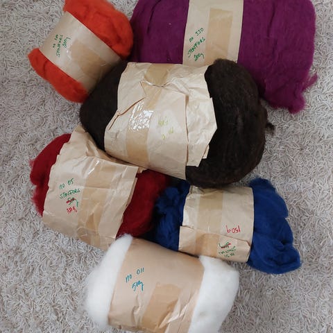 Hyvin säilytettyä, kuohkeaa suomenlampaanvillaa levyinä n. 2,5 kg. Sininen, siniharmaa, vaaleansininen, lila, keltainen,vaaleanpunainen, tiilenpunainen, harmaa, luonnonvalkoinen (osa valkoisista on pienempiä kappaleita).
