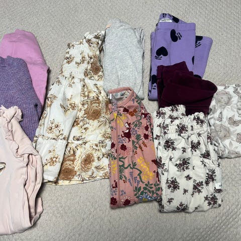 Käytettyjä vaatteita, osaa enemmän ja toisia vähemmän. Haisulihousujen väri kuvassa todellisuutta kirkkaampi, haisuli-kuvio hieman repsottaa. Muutoinkin vaatteiden värit haalistuneet, mutta kotivaatteiksi oikein sopivat.
