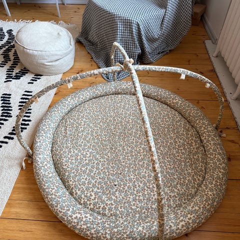 Kuohkea ja pehmeä leikkimatto, koko 80x100. Vain paristi hetken käytetty, tästä huolimatta vauvalta tullut pieni haalea tahra pohjaan, muutoin uudenveroinen enkä ole pessyt. Kiinnitystarrat ja kantokahva, helppo ottaa mukaan. Jokunen koirankarva saattaa tulla kaupanpäällisenä. Nouto/postit, ei toridiiliä.