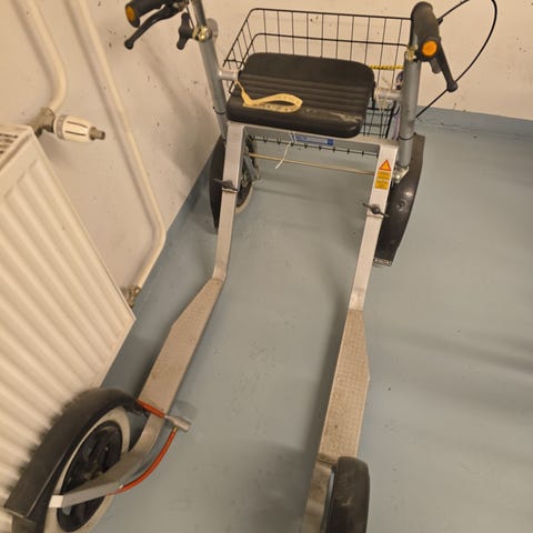 Kolmipyöräinen potkulauta aikuiselle. Mallissa on kaksi suurta takapyörää ja yksi etupyörä, jalkatasot molemmille jaloille sekä ohjaustanko käsijarruilla. Rungon väri on sininen ja pyörissä on umpikumirenkaat. Edessä on metallinen tavarakori pientä kuljetusta varten. Soveltuu liikkumiseen tasaisilla alustoilla, esimerkiksi pihassa tai kävelyteillä.