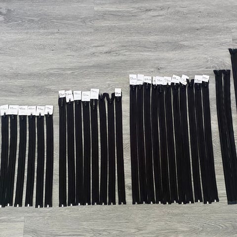 Kasa eripituisia vetoketjuja. Osa uusia, osa käytettyjä, mutta erinomaisessa kunnossa. Nappisarjoja ja hakasia.