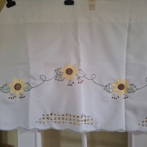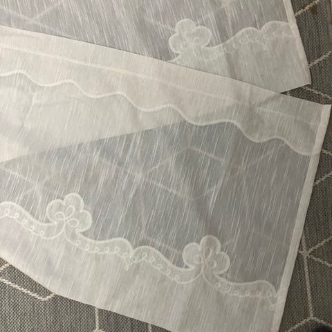 Vaalea sävyinen kukkakuvioinen verhokappa. Korkeus 63 cm leveys 246 cm