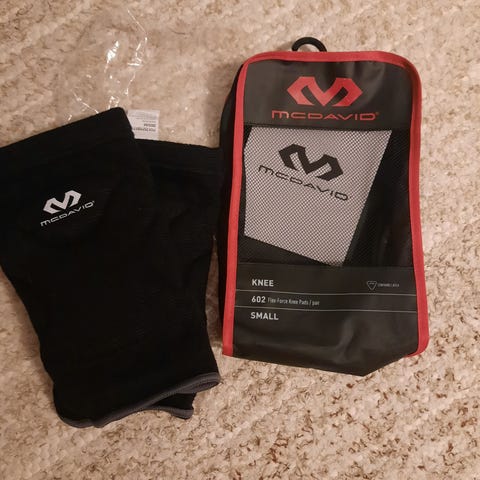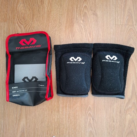 McDavid polvisuojat mustaa kangasta. Pehmustetut suojat polville, sopivat esimerkiksi sisäliikuntaan ja lajeihin, joissa polvet tarvitsevat lisäsuojaa lattiaa vasten. Logot edessä, joustava resori ylä- ja alareunassa. Ehkä kerran kokeiltu käytössä, mutta vastaa aivan uusia.