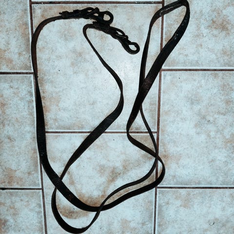 Nahkaiset mustat ohjat hevoselle. Ohjissa on säätösoljet kiinnitystä varten ja kumipintaiset tai uritetut otteet paremman pidon takaamiseksi. Luminen osa yhdestä kohtaa hiukan kulunut mutta ehjä.