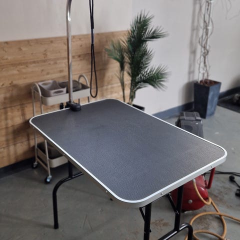 Trimmauspöytä helpottaa koiran trimmausta, harjausta ja kynsien leikkaamista. Trimmauspöytä on tukeva ja turvallinen alusta koiran trimmaamiseen: pöydässä on luistamaton musta kumimatto sekä pyöristetyt, muovilistoitetut reunat.