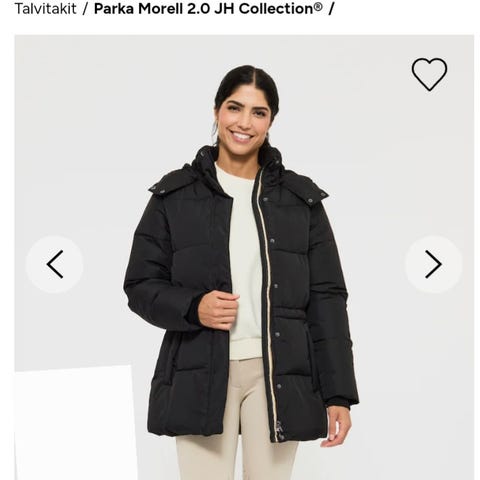 JH Collection by Hööks toppatakki, koko M. Ruskea, paksusti topattu takki, jossa tekoturkiskaulus ja raidallinen vuori. Edessä vetoketju ja painonappikiinnitys sekä koristeellinen nauhayksityiskohta. Hihassa JH Collection -merkki. Normaalisti käytän 42 kokoisia takkeja, mutta tämä sopii minulle silti hyvin, kun olen pienirintainen. Tosi lämmin. Ihana!