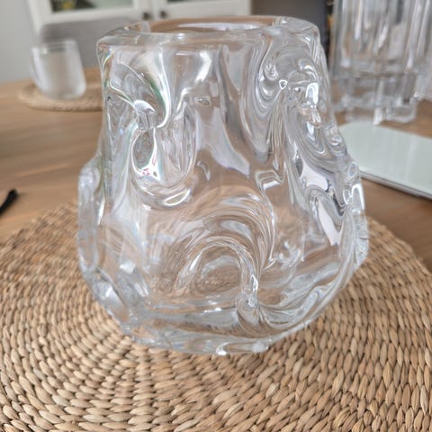 Tynell Bora Bora. Kuvissa näkyy yksityiskohtia maljakon pinnasta ja reunasta, joiden avulla kunto on arvioitavissa. Kahdesta kulmasta pala pois. Ei vaikuta käyttöön eikä huomaa kuin tarkasti katsoessa. Huomioitu hinnassa. Vain nouto Porista.