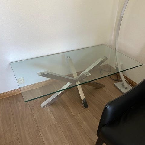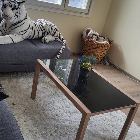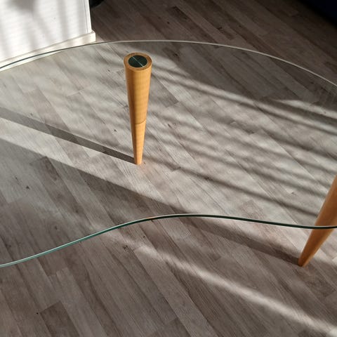 Myydään näyttävä ja kaunis sohvapöytä, aaltoileva lasikansi, puiset jalat.