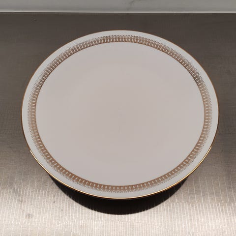 Rörstrand lautaset, valkoista posliinia kullanvärisellä reunuskoristelulla. Halkaisija 20cm ja korkeus 4cm. Käytetty ehjä kunto. Kultareunus paikoin hieman kulunut.