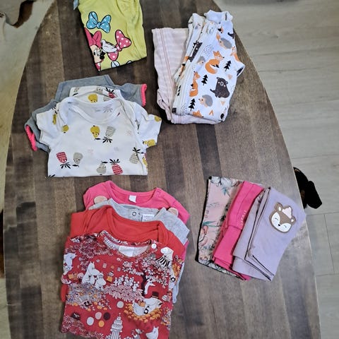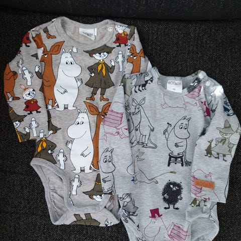 Vaatepakettina 68 koon collegehousut, muumibody, pikkusen haalarit. Kunto hyvä.