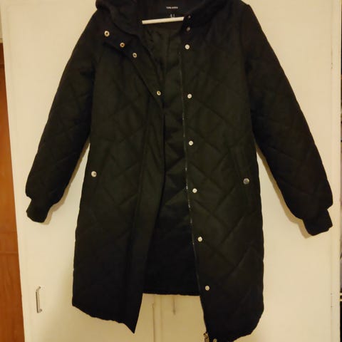 Vero Moda naisten talvitakki, koko M. Pitkä, musta, tikattu malli. Materiaalina polyesteri. Takissa on pystykaulus ja kevyt toppaus. Hihassa Vero Moda -merkki. Huppuun kuuluu karvareunus.