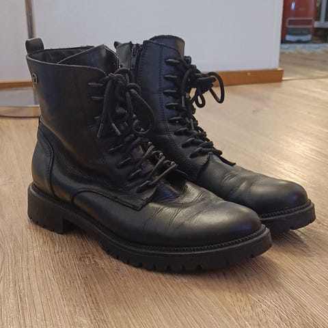 Tamaris saappaat, koko 40. Väri musta. Nilkkapituiset saappaat, joissa on leveähkö korko ja sivuvetoketju pukemista helpottamaan. Sopivat arki- ja kaupunkikäyttöön. Näyttää kivalta myös juhlissa jotka eivät ole ylen juhlalliset.