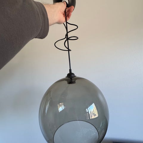 Kaksi lasista valkeaa, pallomuotoista kattovalaisinta.