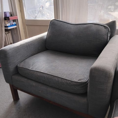 Tummanpunainen nojatuoli. Hyvä kunto, mutta kulumaa.