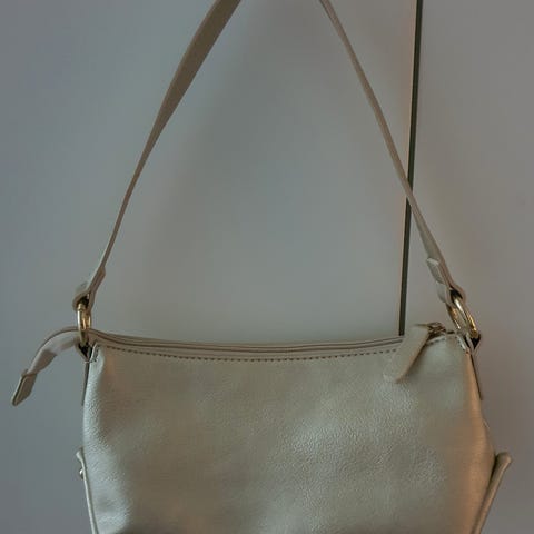 H&M olkalaukku naisille. Materiaalina tekonahka, pintakuvioitu vaalea beige sävy. Laukussa on säädettävä olkahihna ja vetoketjusuljenta. Metalliosat ovat kullanväriset. Pieni koko sopii esimerkiksi lompakon, puhelimen ja pienten henkilökohtaisten tavaroiden kuljettamiseen arjessa tai menoissa.