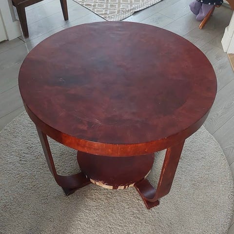 Tumma pyöreä sohvapöytä. Täyspuinen.
