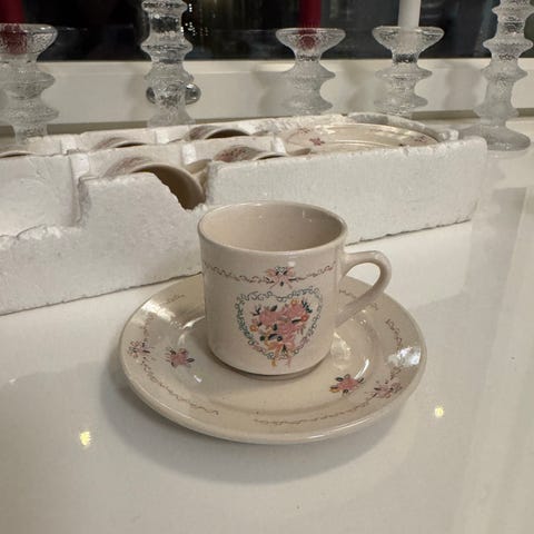 Vintage lasten leikkiastiasto, posliini. Settissa on iso kahvikannu, kermakko, 2 kpl., sokerikko, 2 kpl, muki, 3 kpl. ja maljakko.