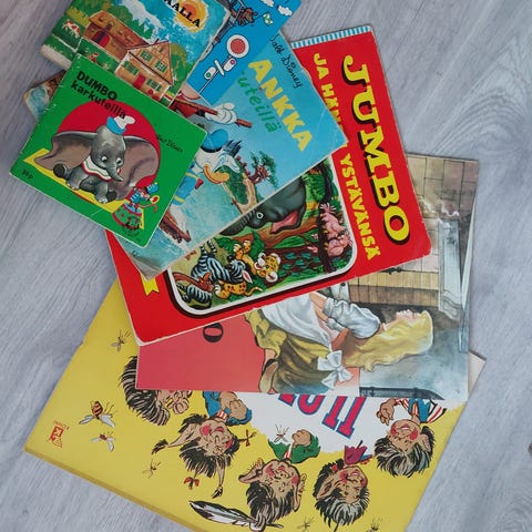 * Kaikki sisältä ikäisekseenkin siistikuntoinen kovakantinen kirja; #1,2,4,5 Pepi, Dumbo, Aristokatit Tämän kirjan omistaa -kohdassa nimi, #1 Pepi #takakannen sisäosan yläreunasta hieman paperirepeämää; 3 Leevi viimeisellä lehdellä ryppy; ; muutoin pikaisella selailulla en huomaa kuin sivun käännöstä johtuvaa ’painaumaa’, ei suttuja tms, vanhimmissa kirjoissa toki selvästi muita enemmän lukujälkeä; kansissa vaihtelevasti erilaista säilytysjälkeä; osa luullakseni 1. painos (koska muutakaan en huomaa); lisätietoja/kuvia pyynnöstä