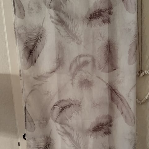 Mukana muun muassa sinisillä kukkakuvioilla varustettu kappa (noin 200 x 40 cm), valkoinen kirjailtu kappa (noin 44 x 260 cm), kukkakuvioinen suihkuverho (noin 170 x 196 cm) sekä viininpunaiset verhot metallirenkailla (noin 150 x 240 cm, 2 kpl). Lisäksi kuvissa näkyy muita tekstiilejä, kuten lakanoita ja mattoja.