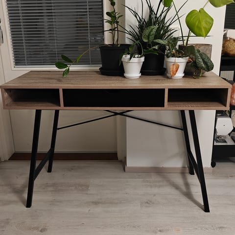 Jysk desk with a wood-patterned table top and black metal legs. The table has open storage compartments and a drawer in the middle for small items. Suitable as a desk or writing desk for example at home or in a home office. There is open space under the table for legs and possible additional storage solutions.