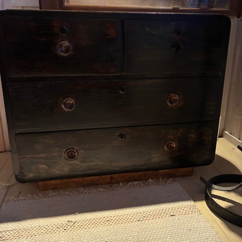 Tumma antiikki tyylinen lipasto koristeellisilla kahvoilla.