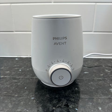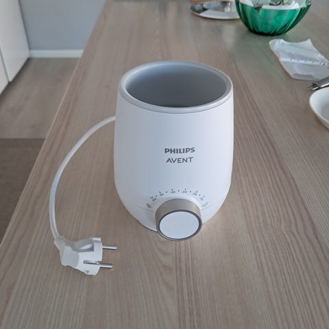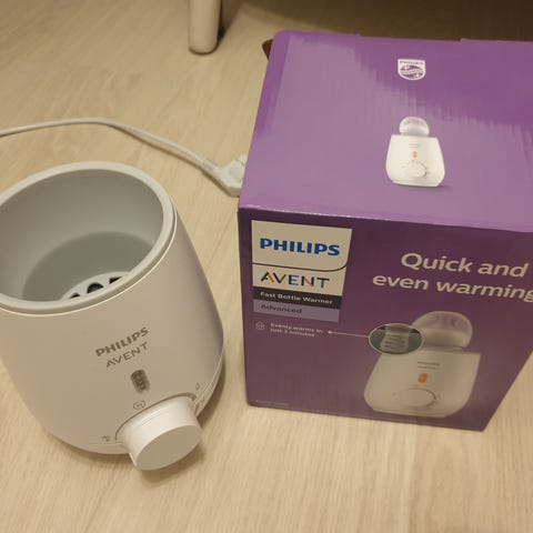 Philips Avent pullonlämmitin. Sähkökäyttöinen lämmitin tuttipulloille ja vauvanruokapurkeille. Laitteessa on etupaneelissa säätönuppi eri lämpötila- ja aika-asetuksille sekä virtapainike. Sisäosa on muotoiltu pitämään pullon tai purkin paikallaan lämmityksen aikana. Soveltuu vauvanmaidon ja -ruoan lämmittämiseen kotikäytössä. Väri vaalea, materiaali muovia.