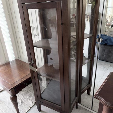 Puinen tummanruskea vitriini. Hyvä kunto. Alaosassa myös 4kpl laatikoita.