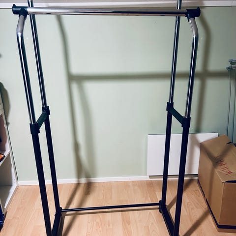 Metallinen musta naulakko, jossa ylhäällä vaakasuora tanko vaatteiden ripustamiseen henkareilla ja alhaalla kaksi tasoa esimerkiksi kenkien tai laukkujen säilytykseen. Sopii eteiseen, vaatehuoneeseen tai muuhun tilaan, jossa tarvitaan avointa ripustus- ja säilytystilaa vaatteille ja asusteille.