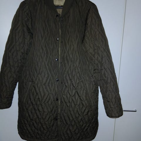 Naisten pitkä takki, koko L. Vihreä väri ja tikattu pinta. Materiaalina polyesteri. Takissa on vetoketjukiinnitys edessä ja pitkät hihat. Malli ulottuu noin polveen. Sopii arkeen ulkotakiksi viileämpiin säihin.