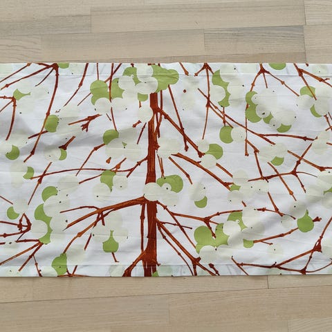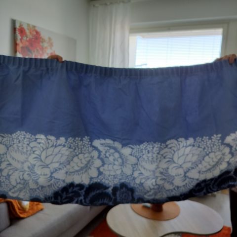 Marimekko huhuli- kankaasta siististi ommeltu verhokappa, koko noin 158 x 47 cm. Tankokuja ylhäällä 3 cm levyisenä. Nouto Kangasalta.
