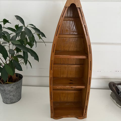 Puinen kevytrakenteinen, veneen mallinen hylly. Korkeus 185cm, leveys n. 50cm.