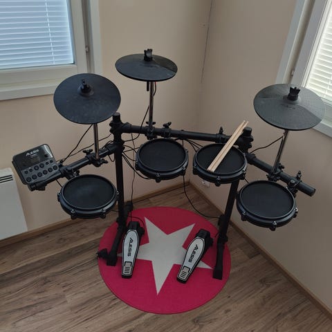 Myydään kuvan mukainen Alesis DM6-sähkörumpusetti uuden setin alta, aloittelevalle rumpalille suunnattu setti.