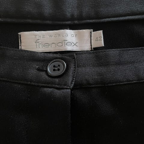Naisten mustat ihonmyötäiset housut, koko 42. Materiaalissa on elastaania, mikä tekee housuista joustavat ja mukavat päällä. Vyötärö 90cm, pituus 94 cm. Lahkeissa takana lyhyt vetoketju, samoin etutaskuissa.