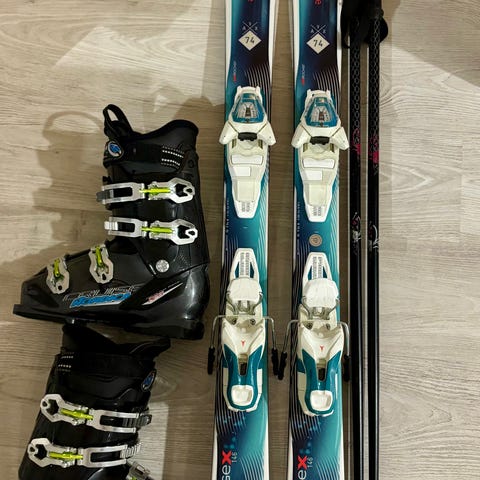 Nordica-merkkiset laskettelumonot, pohjan pituus 278 mm (koko 230–235) vastaa noin EU 36 kokoa. Settiin kuuluu myös 100cm pitkät everestin sauvat.
