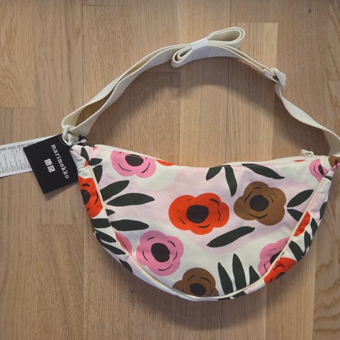 Marimekko olkalaukkua. Puolikaaren muotoinen laukku, valmistettu kankaasta. Laukussa on säädettävä olkahihna ja vetoketjukiinnitys. Kivi kuosi on hillitty, suurikuvioinen printti.Käytetty vain pari kertaa. 30€/kpl