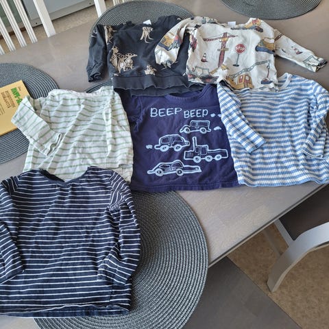 3 kpl housuja ja name itin t-paita.Tahraa ja reikää löytyy,näistä kuvat.Tahroihin en ole tahranpoistoaineita kokeillut.Käyttökelpoisia vielä huonommiksi vaatteiksi vaikka.