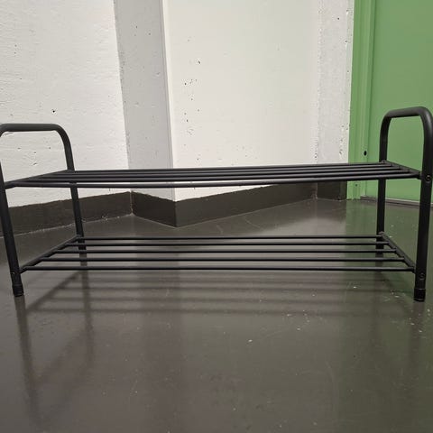 Metallinen tummanharmaa kenkähylly. Maksut mobileylla