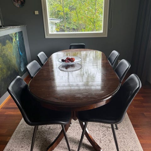 Kookas ruokapöytä, 145x145cm. Massiivinen ja painava, jonkinlaista puristemateriaalia, kiiltävä pöydän pinta. Käytön jälkiä löytyy, näitä kuvissa. Erittäin hyvin soveltuu lapsiperheelle tukevuutensa ja kokonsa puolesta. Nouto Tampereelta.