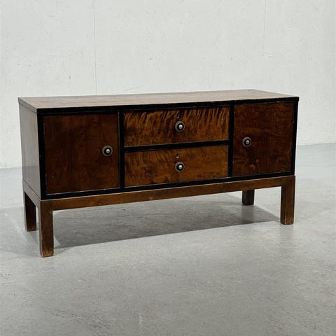 Kolmella laatikolla ja ovella varustettu ruskea funkkis tyylin senkki. Senkissä on mustat vetimet ja se seisoo neljällä suoralla jalalla.