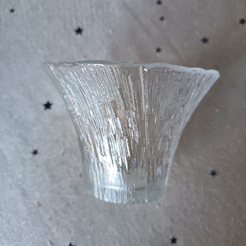 Lasikulho. Pertti Santalahden "Kasvimaalla." Kirkasta lasia, reunoiltaan aaltoileva. Sopii esimerkiksi tarjoiluun tai koristekäyttöön kodin eri tiloissa.